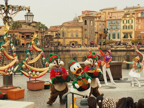 ショーが始まりました クリスマスの音楽とともに3回目のパーフェクト・クリスマスが始まりました リドアイルからだとミッキー達の登場が見える! こっち向いてー!って無理ですよねw ドナルドがリドアイルに到着しました! 向こう岸ではグーフィとマックスが…