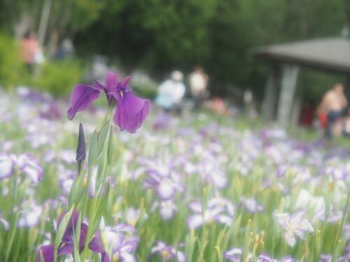 相変わらず構図に悩みながら撮影 一休みしたので、カメラを持ってまた菖蒲園へ 菖蒲園の中にある遊歩道と菖蒲 中央より右側に寄せた方がいいかな? 普通に撮ると雑多な感じになっちゃう 迷うとやっぱりアップになっちゃう 引き続きどう撮ったらいいのか迷い…