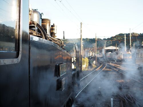 新金谷駅到着 1号車に乗っていたので、直ぐに降りたらまだ蒸気がもわもわしてた! 運転席。この重厚感、すごいカッコイイ!!! 急行のマークが板! SLの運行を支えてくれる電気機関車が最後尾にいます。今回はいぶき501でした。 大迫力だった転車台での方向…