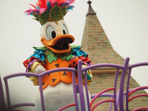 ドナルドのフロート到着! ドナルドきたー! まだフロートは動いてるけど、お城バックに撮れた! ポーズが可愛いドナルドさん! ドナルドさん、小道具的なマラカス持ってるからか、ポーズが可愛い!! シャカシャカしてみたり マラカスをおでこの前でトント…